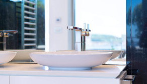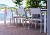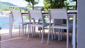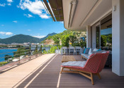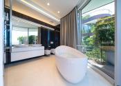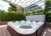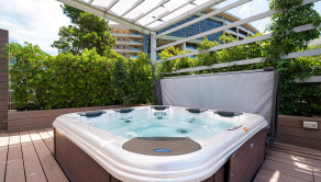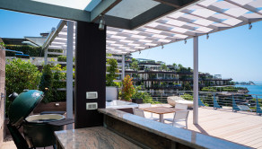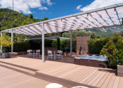 Na prvom poschodí je otvorená priestranná terasa s posedením, vírivkou, sprchou, barovým pultom, ležadlami, pohovkami a grilom.